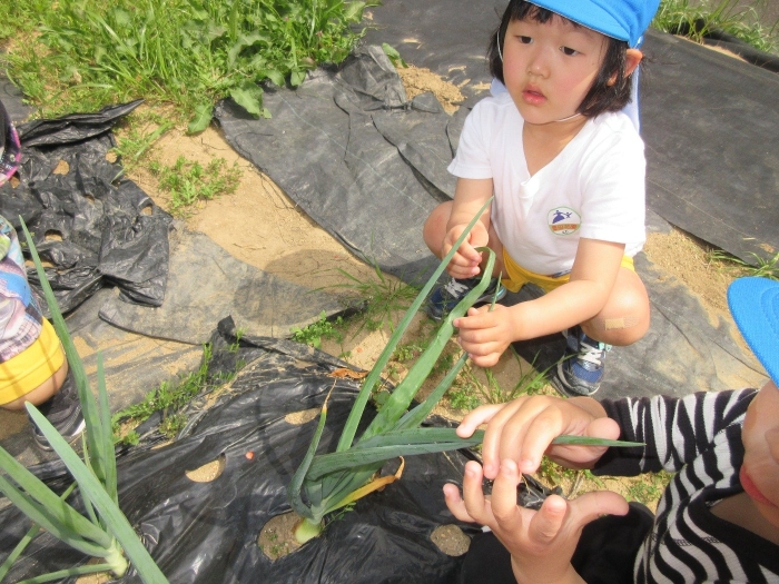 畑につくと、葉っぱを見ながら「大きくなってるね!」「この葉っぱが一番大きくなっているよ!」と観察していました。根っこの土の部分を触りながら、「どのくらいの大きさなのかな?」と成長した玉ねぎを楽しそうに想像していましたよ!