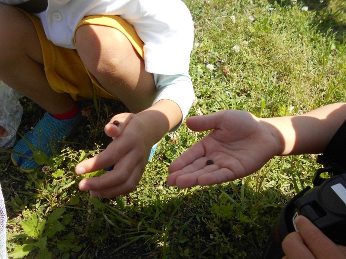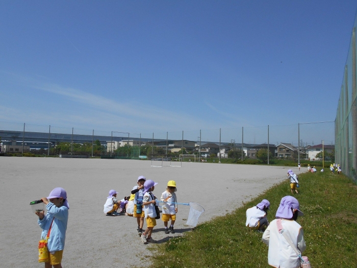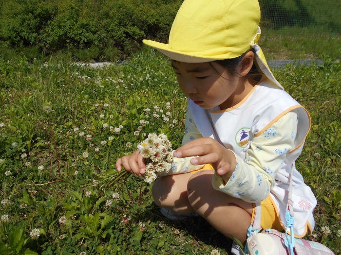 先日に引き続き、今日も年長さんが春探しに出掛けました♡ 今日は川沿いより少し先の「若園運動広場」まで行ってきました!!運動広場にはシロツメクサが一面に咲いており、「きれいだね~!!」と言いながら花束になるほど摘んでいました(^▽^)/ また、お天気がよかったのか、てんとう虫やカエルさんにもたくさん遭遇( ´艸`)手のひらにのせて楽しんでいる様子が伺えました♡風もなく、お散歩には絶好のお天気日和で、お子さま達は存分に春探しを堪能することができました♡