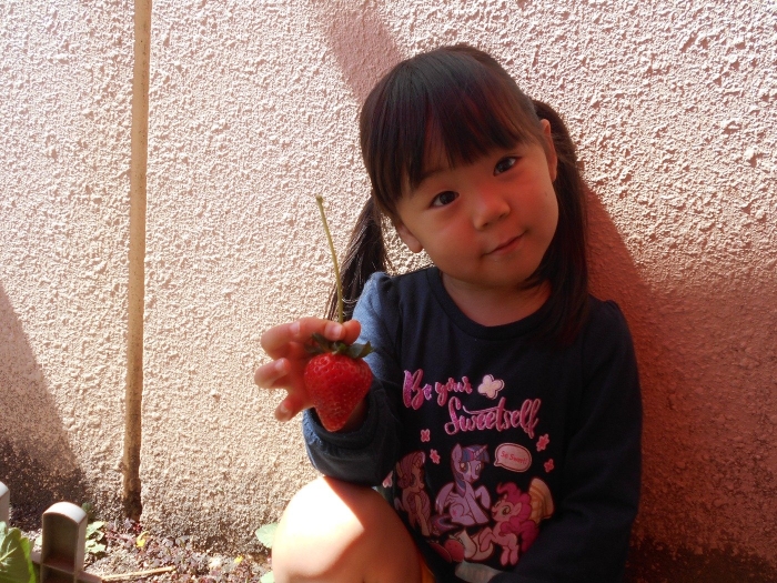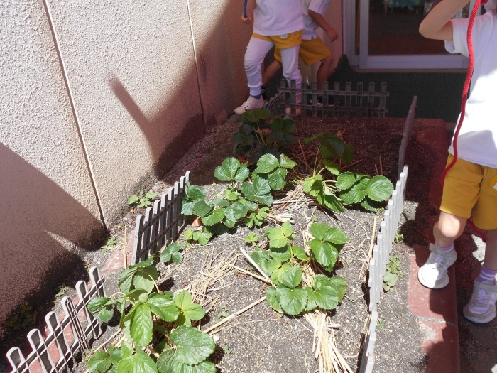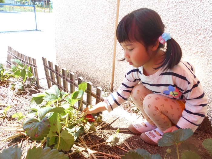 昨年、年中さんがみんなで植えたいちごの苗に、ついに赤い実が!!!4月に入ってから小さな緑色の実がつきだし、お子さま達が「もうすぐ食べれるかな~」「早く赤くなるといいね~」と心待ちにしながら水やりをしていました。ゴールデンウィークがあけた今日、いちごの花壇をのぞくと。。。 「!!!!」「すごー---い!!」「いちご狩りのいちごがあるー---!!!」と大興奮のお子さま達(^▽^)/おやすみの間にすっかり大きくなり、とっても美味しそうな赤いいちごに変身していました♡ もう少したくさん収穫したら、みんなでいただこうね!!