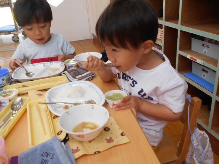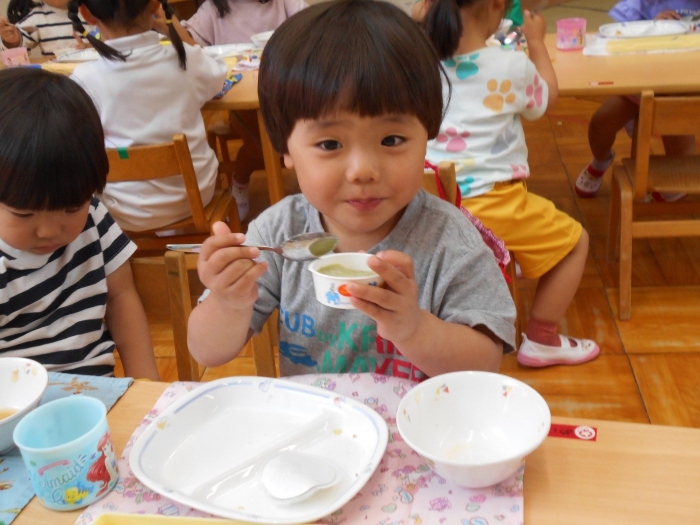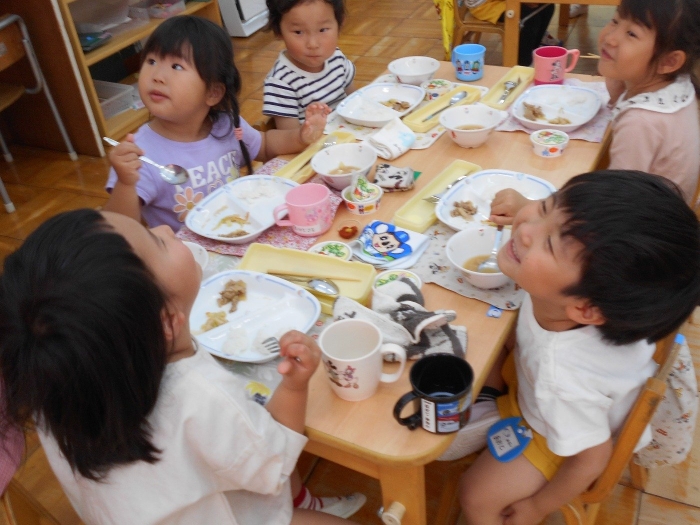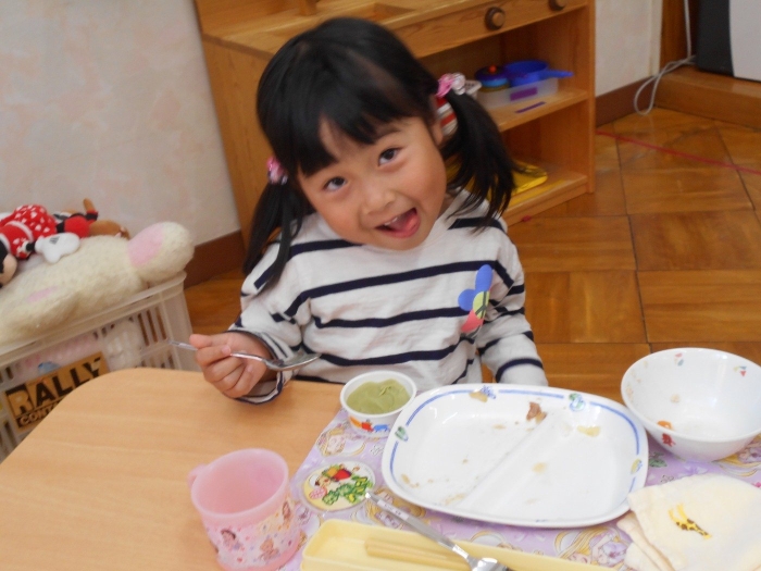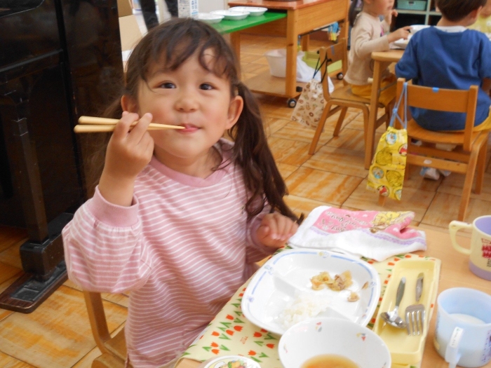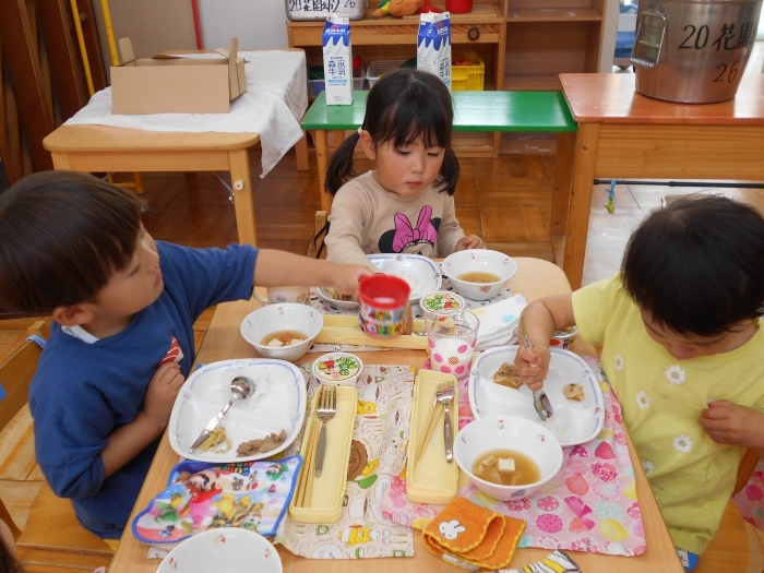 昨日から、年少さんも給食が始まりました(^▽^)/ 「今日は幼稚園で給食を食べるんだよね♡」「スプーンとフォークを持ってきたよ♡」「いつ食べるのかな~♡」などと、給食を楽しみにしてるお子さま達の声があちこちから聞こえてきました♡いつもより少し早めにお片付けをして、先生のお話を聞きながら1つずつゆっくりと給食の支度を進めるお子さま達♡「いただきます」の前にちょっぴり味見!?をしているお子さま達もみえましたが( ´艸`)、みんなで美味しく給食をいただくことができました♡おかわりもたくさんしたよ!!