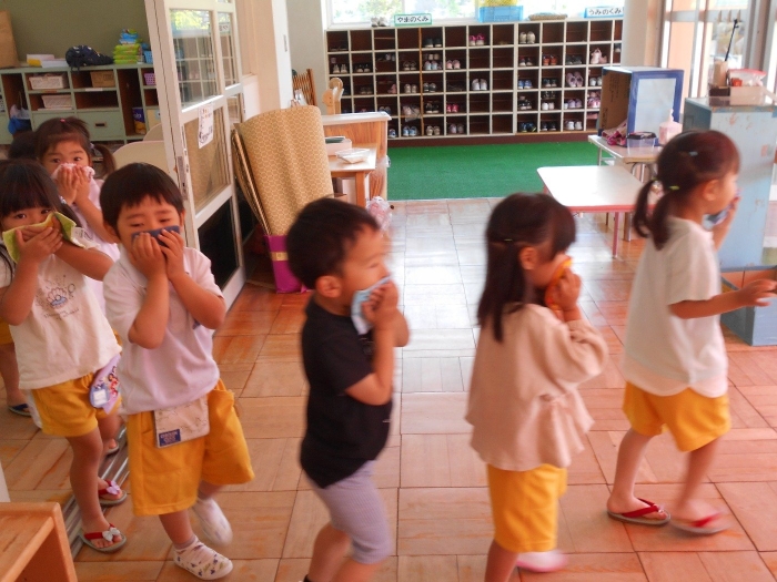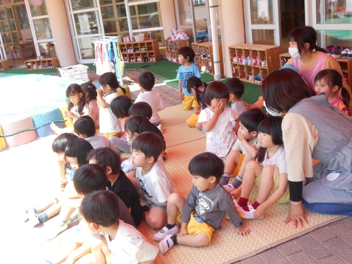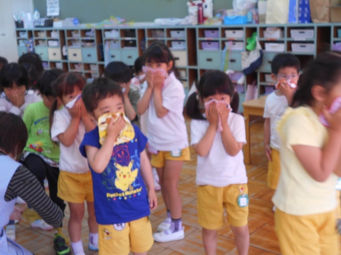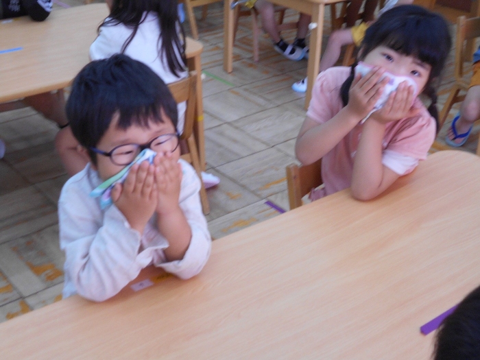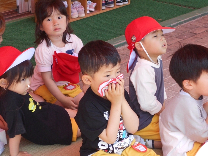 今日は「火災」を想定した避難訓練をしました。事前に先生から火災が発生した時の避難の仕方や、「おかしも」・・・お→押さない か→かけない し→しゃべらない も→戻らない についての話を聞きました。避難の際には、煙を吸わないようにとハンカチで口を押さえ、先生や友だちと一緒に落ち着いて行動することができました。