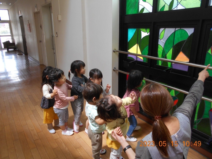 電車になってお部屋を探検しに行ったよ☆ステンドグラスの窓でちょうちょやチューリップを発見!!