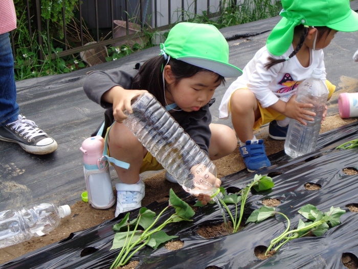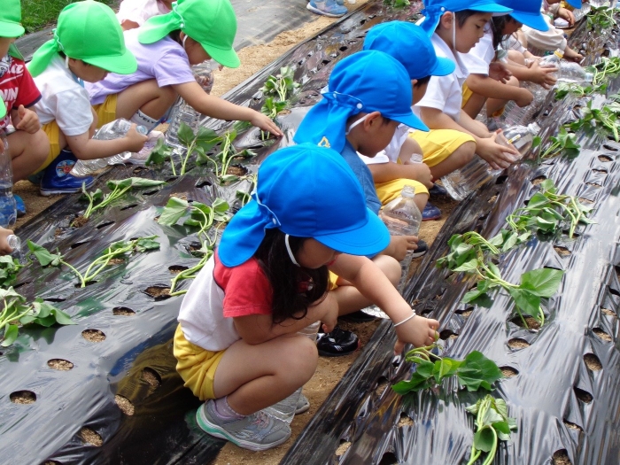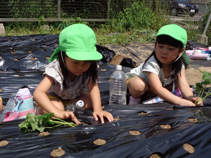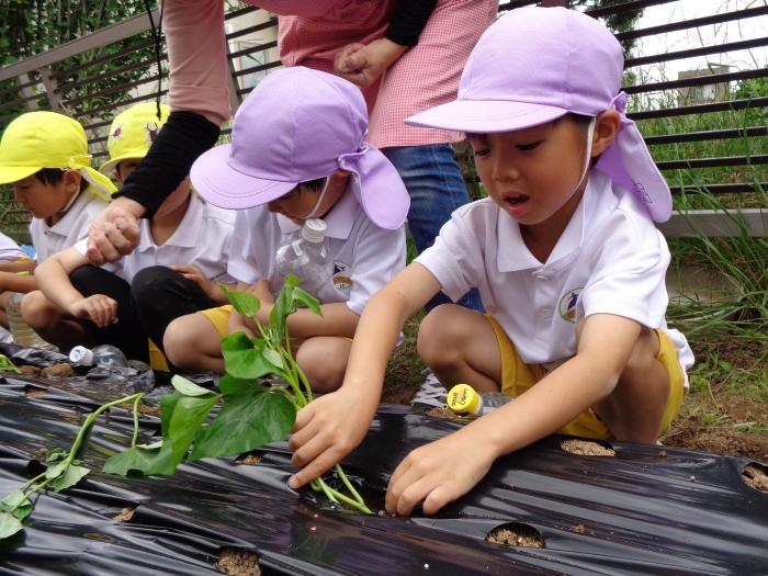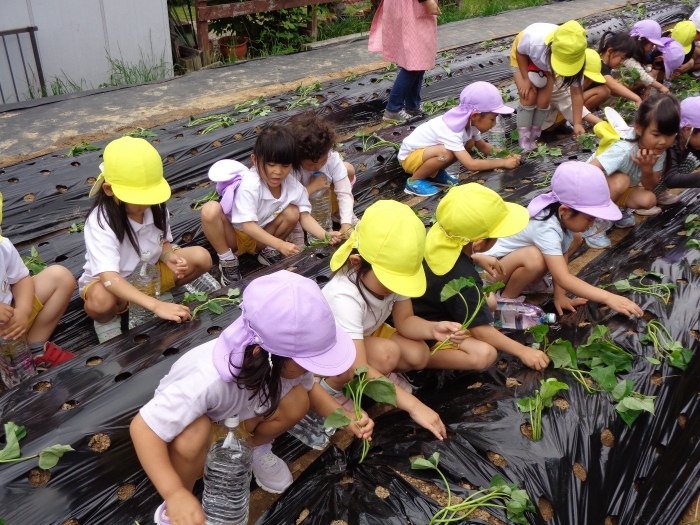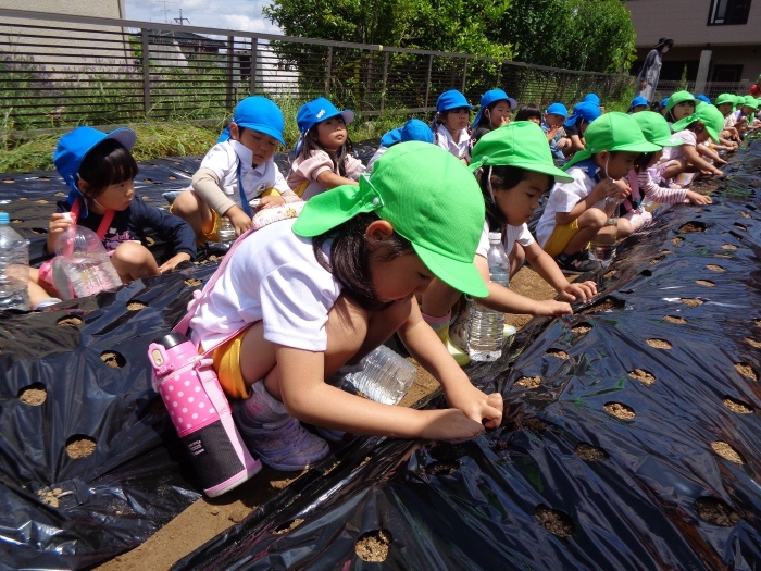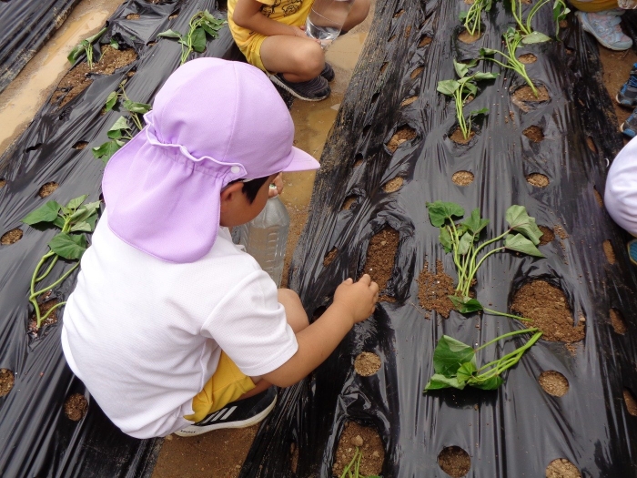 先日、玉ねぎを収穫した畑を、年長クラスのお子さまのおじい様とお父様がきれいに耕して、立派な畝を作ってくださいました。今日は年中さんと年長さんがその畝に、さつまいもの苗を植えました。ふかふかの土に穴をあけ、さつまいもの苗をそーっと寝かせてあげます。最後に土のお布団をかぶせて、大好きなお水をたっぷりあげてきました。秋には大きなお芋ができるといいね!!