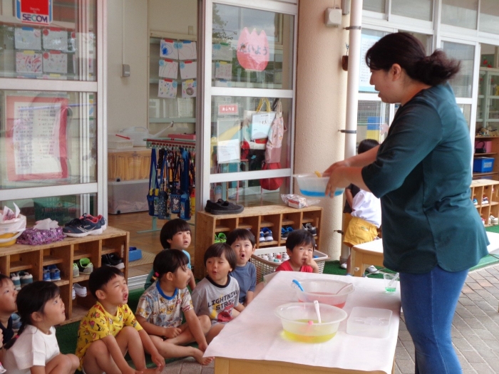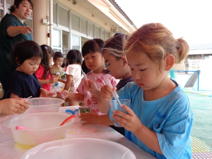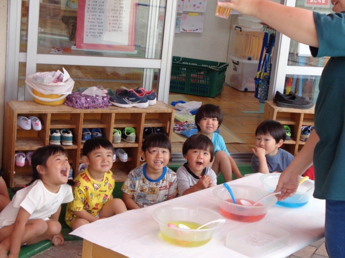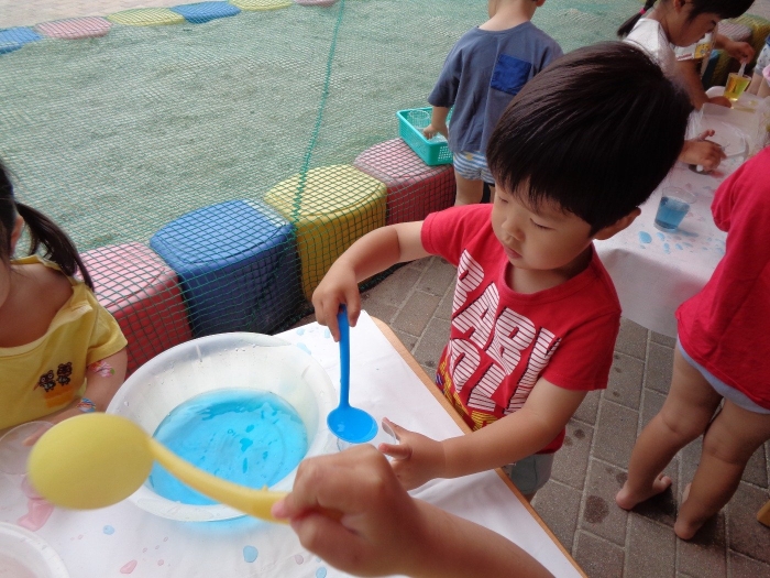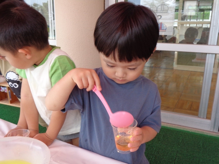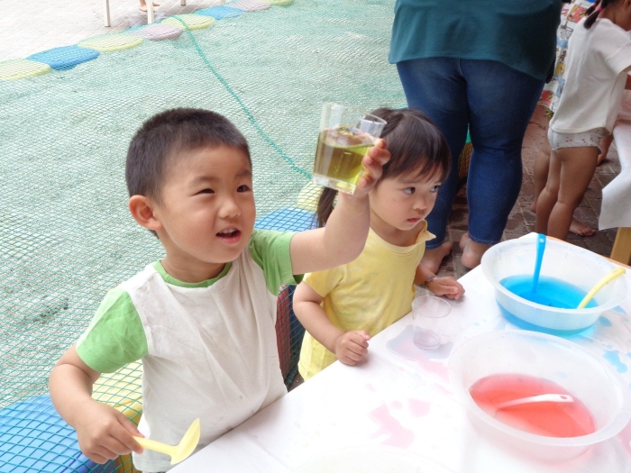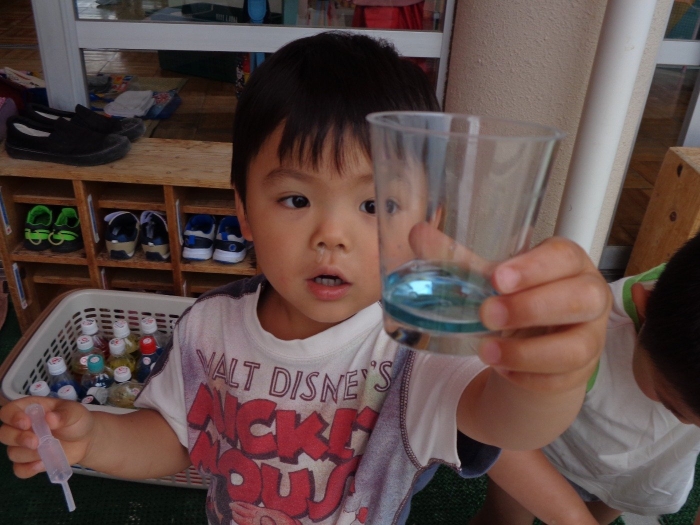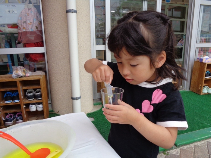 今日はたいようの組が色水あそびをしました♡ ペットボトルにきれいな色の水が入っているのを見て、「わーー♡ジュースがあるよ!!」「きれいだねー!!」と興味津々のお子さま達。きれいな色のお水を使って遊べると聞き、ワクワクです(^▽^)/ 早速お着替えをして、色水あそびが始まりました!! 1人1個ずつ用意された透明のコップに、好きな色水をスプーンやスポイトで入れていきます。色が変わっていく様子に喜んだりしながら色水あそびを存分に楽しむ様子が伺えました(^▽^)/またあそぼうね♡