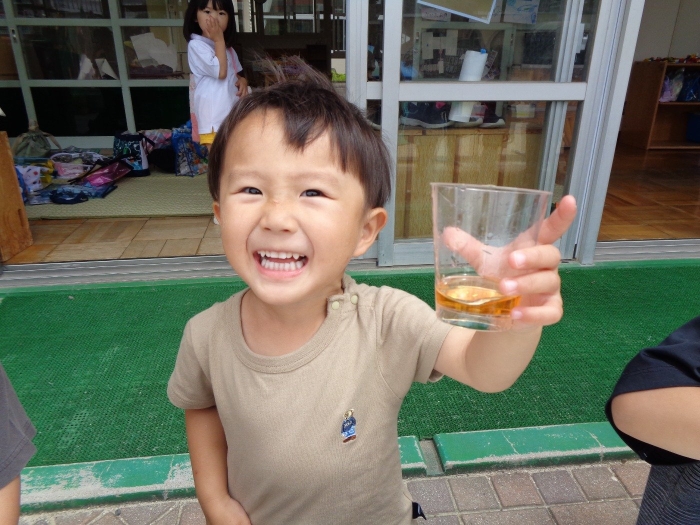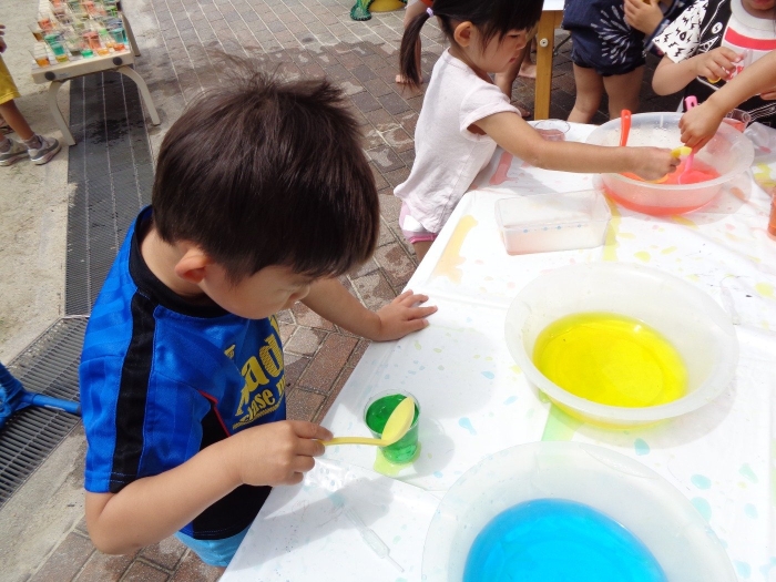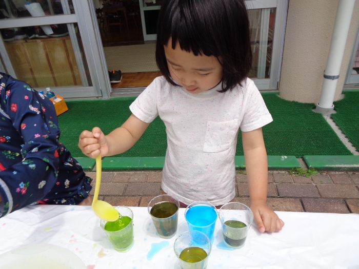 「見て見て~ジュースやさんしてるんだよ!!」「みどり色はどうやって作ったらいいのかな~」などと先生やお友だちと話しながら色水あそびを楽しむことができました♡ 色とりどりの綺麗な色水がたくさんできました♡