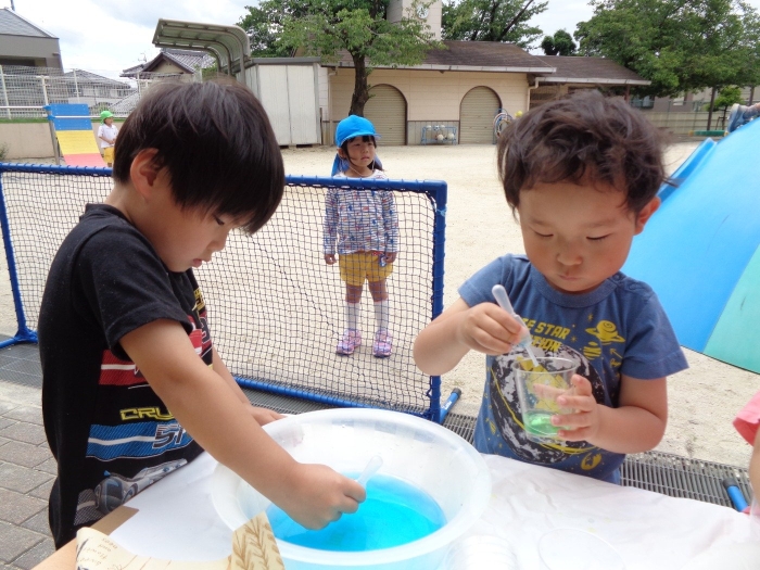 昨日たいようさんが色水あそびをしていたのを見て、「おおぞらさんもやりたいね~」と話していたお子さま達。