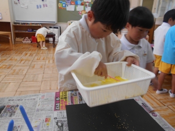 次に、絵の具とかご、歯ブラシを使って「スパッタリング」という技法に挑戦し、星空を表現しました!絵の具が飛び散る様子にみんな夢中になってたくさんの星たちを作ってくれましたよ♡