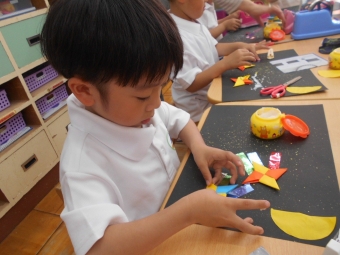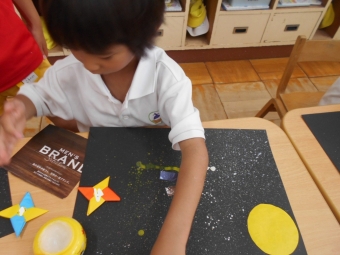 最後に、「スパッタリング」した画用紙に、お月さまと手裏剣、キラキラテープを貼り付け、流れ星の完成です!みんなとっても素敵な作品が完成したね♡