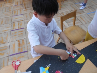 今回は、折り紙や絵の具、テープなど様々な物を使い製作を行いました。