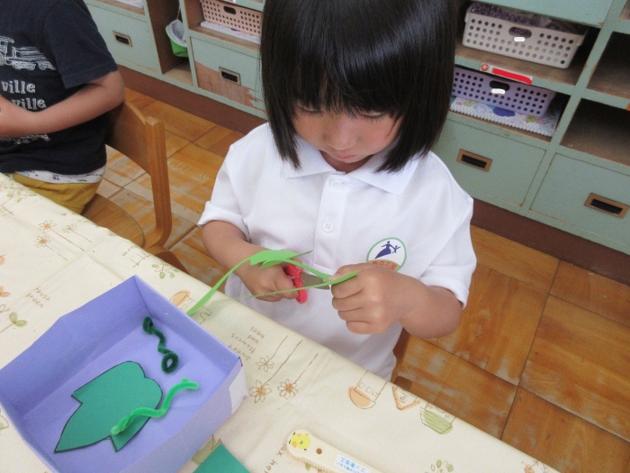 自分で葉っぱを切り、モールを鉛筆に巻き付けて表現した蔓と一緒にうちわに貼ると完成です!!