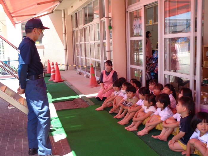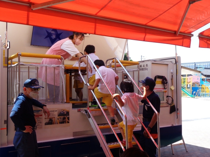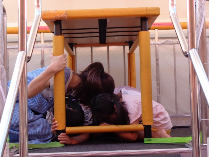 今年度も防災教育の一環として、防災指導車「防サイ君」による地震体験をしました。震度4の揺れの中、消防士さんに教えていただいたように「頭」を守り、揺れが収まるまで待つという訓練をしました。体験の様子をご覧ください。