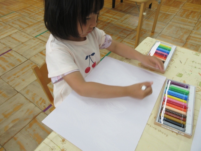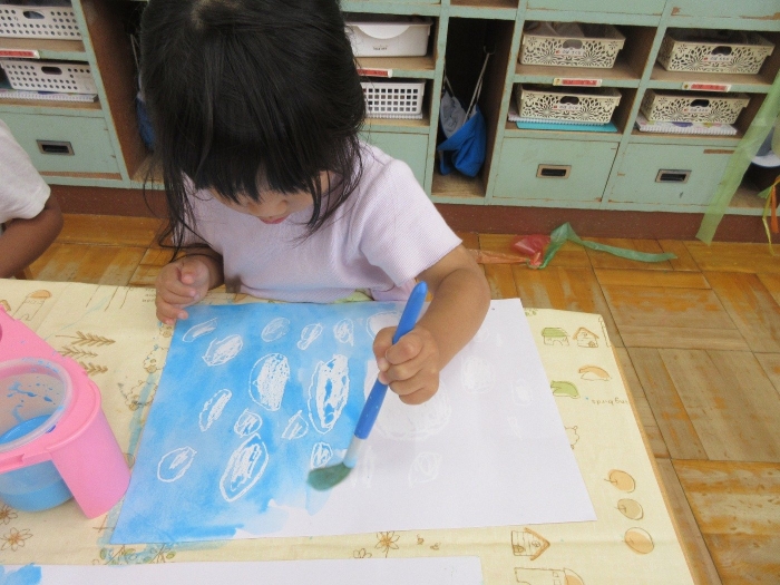 最初に画用紙に白のクレヨンで雫の模様を描いてはじき絵をしました。「私のは大雨!」とたくさん雫を描いたり、雫の形にこだわったりと自由に描くお子さまたち。絵の具を付けてクレヨンをはじくと「すごい!雨が降ってきたよ!」と大興奮!自由に雨を表現していました。
