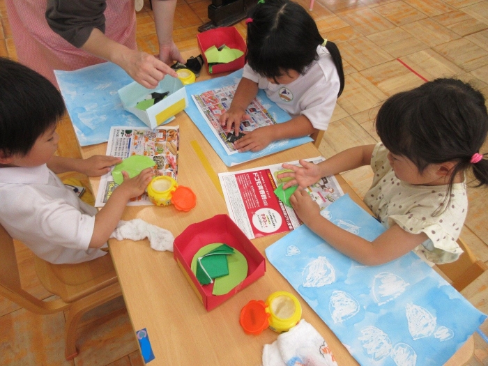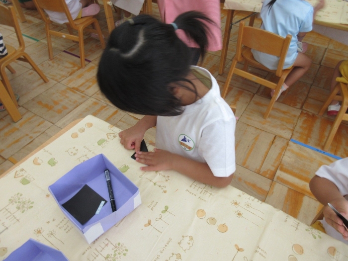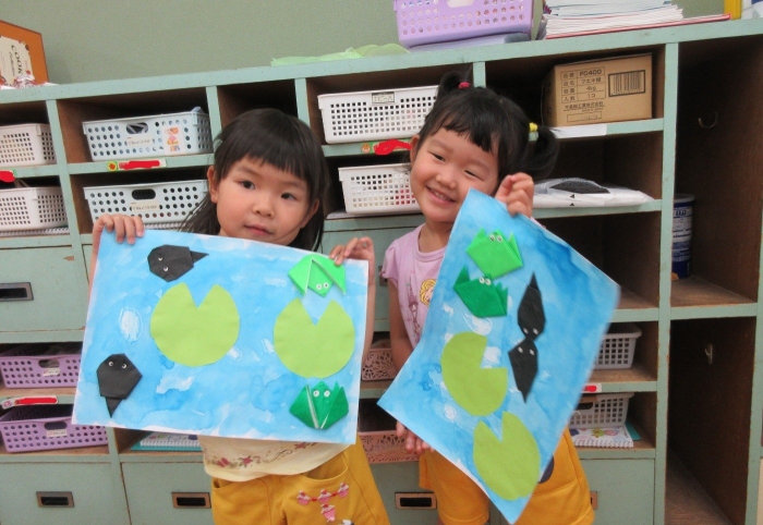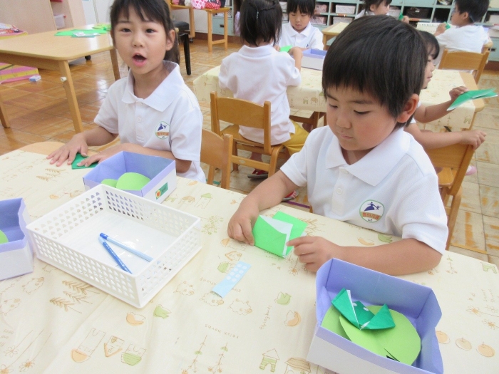 カエルは前に挑戦した袋折りで作りました。「どうやって折るんだっけ?」と苦戦しながらも、前に折った折り方を思い出しながら、上手に折ることが出来ました!オタマジャクシは小さい折り紙を使って丁寧に折っていました。