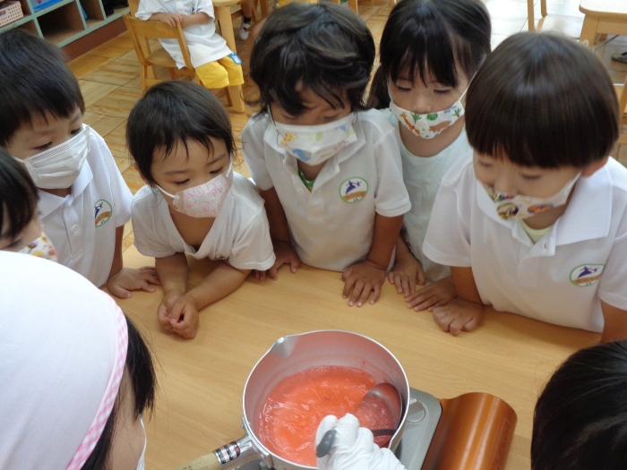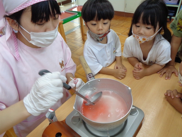 今日は年少さんが初めてのおやつ作りをしました♡ メニューは「寒天ゼリー」です。初めてということで、今日はゼリーの元となる「粉末寒天」「お水」「砂糖」をグツグツ沸騰させ、型に流し込むところをみんなで見学しました(^▽^)/ とろとろだった寒天が、あっという間に固まってゼリーに変身し、お子さま達はびっくり仰天( ´艸`)