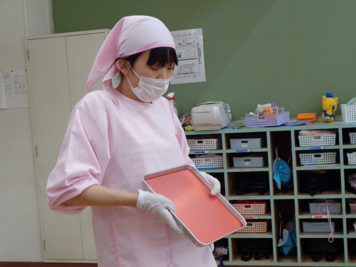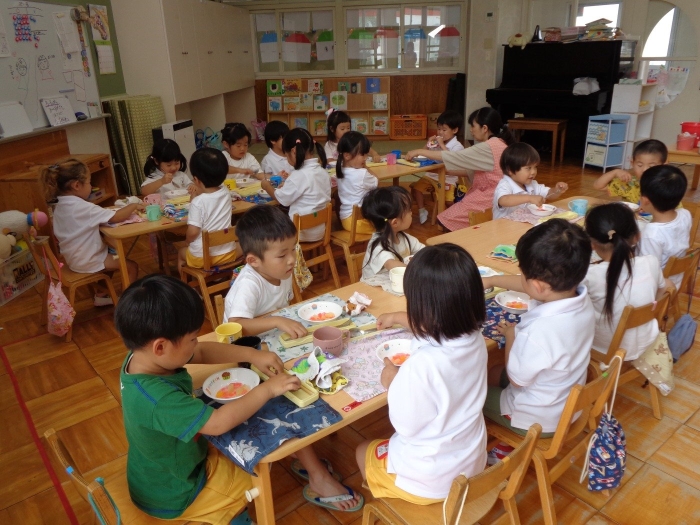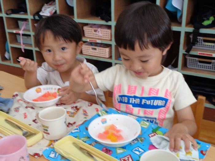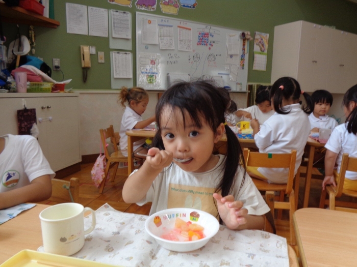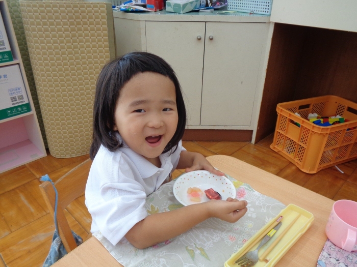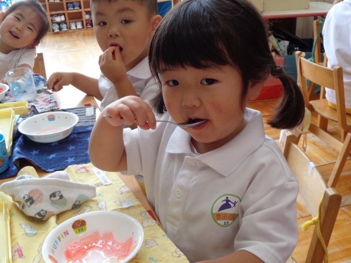 赤色の食紅で色もつけ、美味しそうな寒天ゼリーができあがりました。給食後のデザートに、フルーツと一緒に食べました!!とーーってもおいしかったよ♡