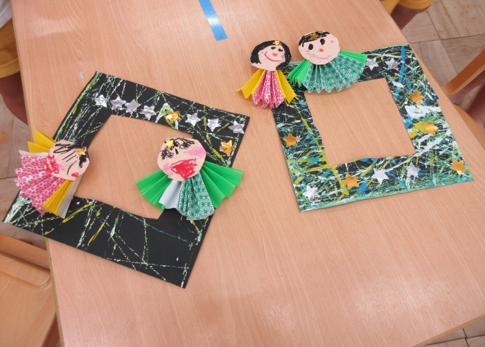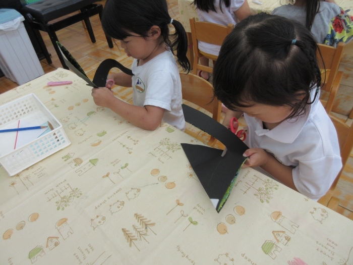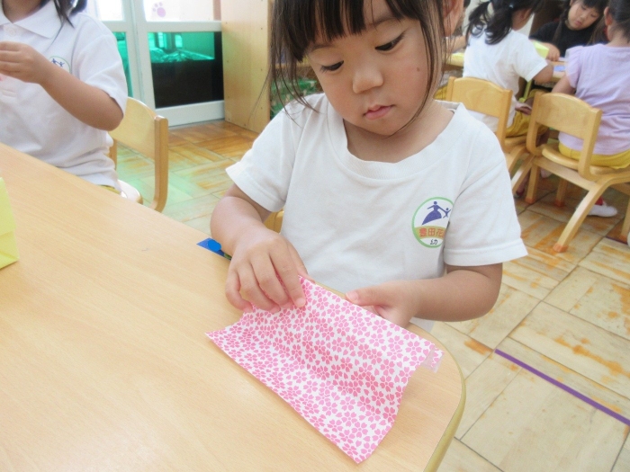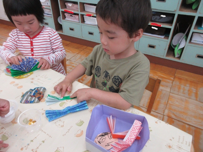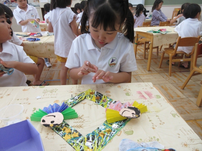 次は、折り紙で織姫と彦星を作りました。丁寧に折り線を付けて、上手に蛇腹折りをすることが出来ました。最後の飾りつけでは、先生から聞いていた七夕の話を思い出しながら、「私は二人が仲良く遊んでるところ!」「今から彦星様が会いに行くんだよ!」という声も…