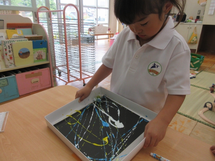 まずは、画用紙に絵の具を付けたビー玉を転がして、土台を作りました。「きれい!流れ星みたいだね!」とわくわくした表情で、ビー玉を転がしているお子さまたち。模様や色が変わっていくのに、夢中になっていましたよ!