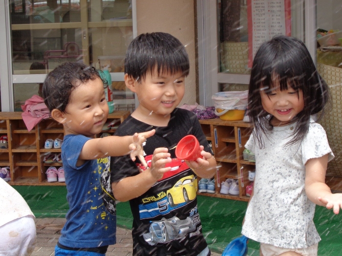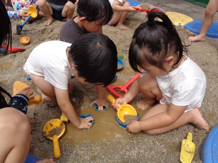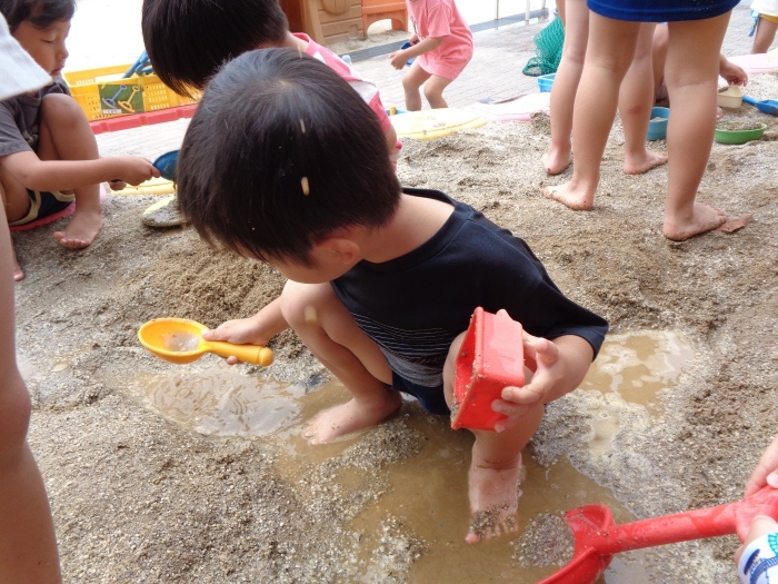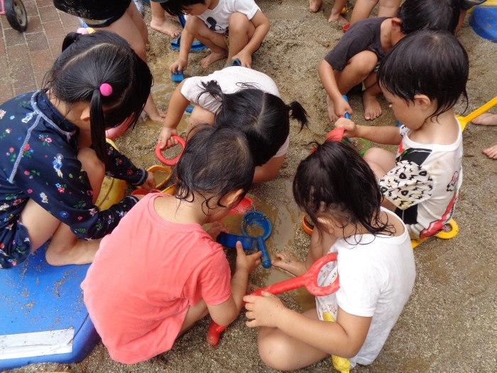 今日はおおぞらの組のお子さま達が、「どろんこあそび」をしました♡ 色水あそびやプールあそびを経験し、少しずつお着替えも上手になってきましたよ。先生が砂場の中へお水を投入すると・・・( ´艸`)大歓声!!「ねーねー!!足いれちゃおうよ!!」「どろどろだねーー!!」と大喜びしながら、どろんこあそびを堪能していました(^▽^)/