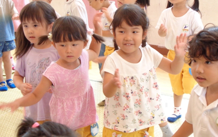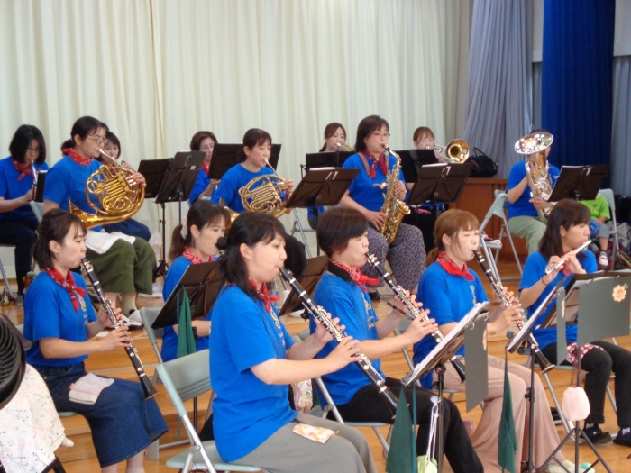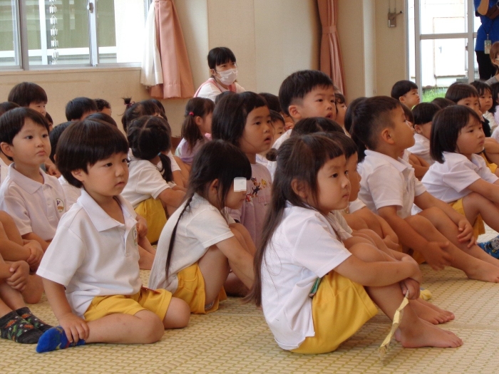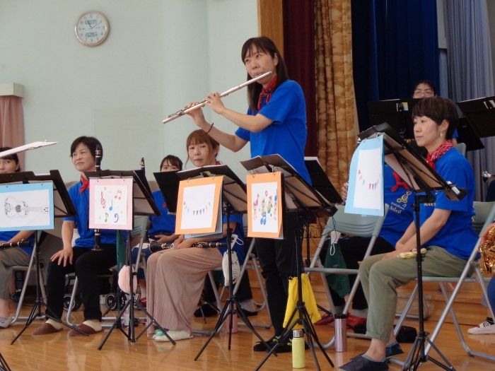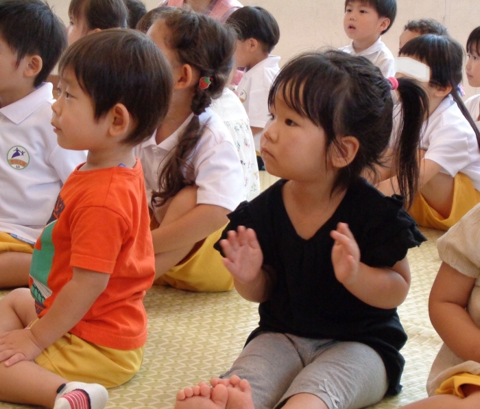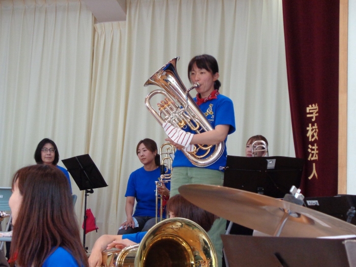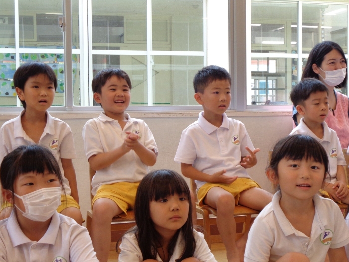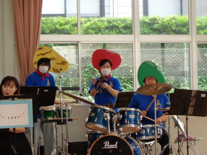 今日は「ママブラス・ソレイユ」の方達によるコンサートを聴きました。普段見たことのない楽器にお子さま達は釘付け(^▽^)/ 色々な曲を披露していただきました。途中みんなでダンスをしたりとロケットさんや年少も楽しんで聴くことができました♡