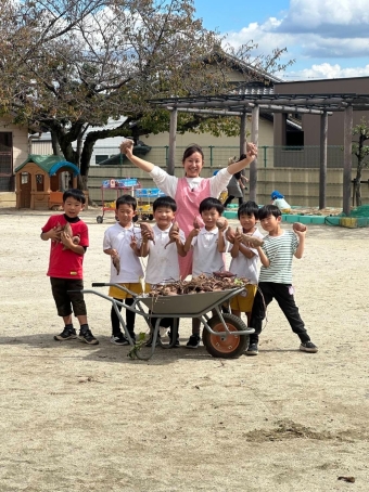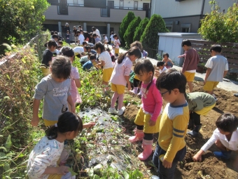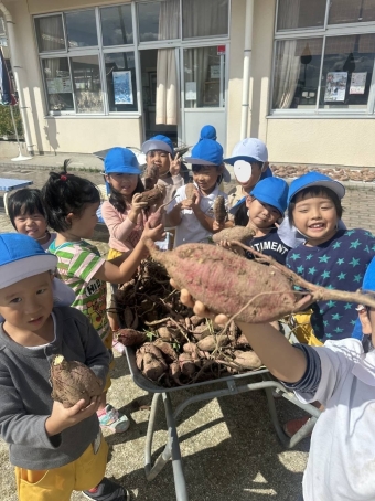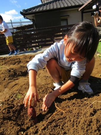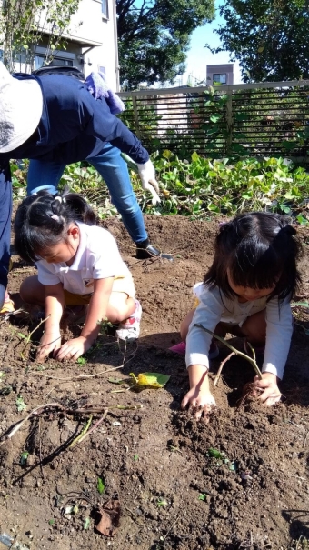 畑に到着すると、さっそく真剣に土を掘っていき、、、中々さつまいもが出てこない時は先生にも手伝ってもらいながら進めていきました。「こんなに大きいの取れたよー!」「3つも繋がってたよ!」など目をキラキラさせながら沢山のさつまいもを収穫することができました。