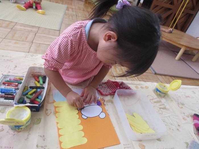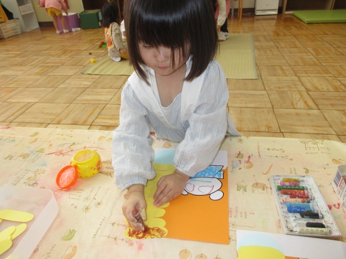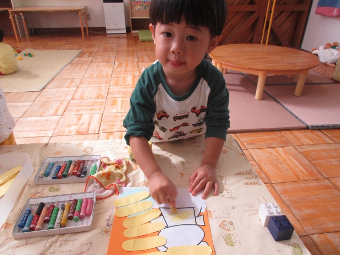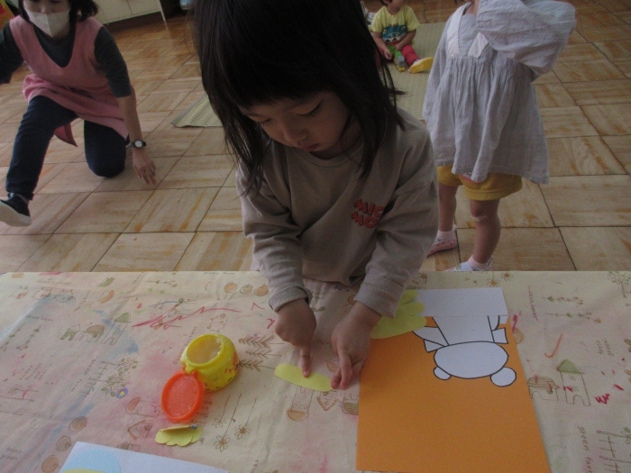 『しろくまちゃんのホットケーキ』の絵本を読んで製作をしました!絵本では、しろくまちゃんがホットケーキを焼いていたので、ロケットさんにはお皿にホットケーキをたくさん積んでもらいました♡顔や洋服も絵本を見ながらかいてみました☆『1の指(お母さん指)で塗ろうね』のお約束も守りながら楽しく製作できました。