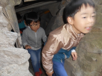 次に、暗闇トンネル、崖のぼりで遊びました。暗闇トンネルは名前の通り真っ暗で少し怖がりながらも何回も何回も挑戦していましたよ!最後に大型迷路で遊びました。中々ゴールできず、苦戦しながらも友だちと協力しながら楽しんでいました。