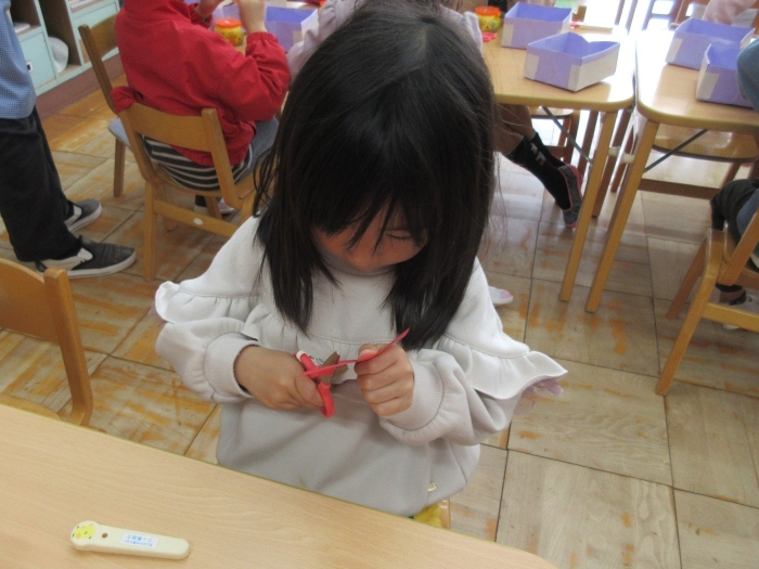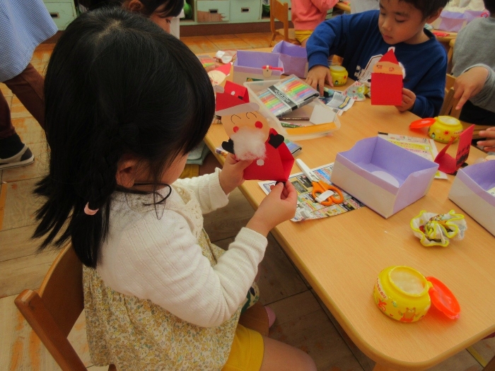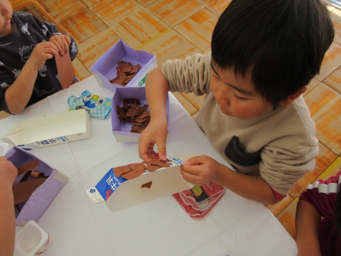 そりとプレゼントボックスは、牛乳パックを画用紙で装飾して作りました。サンタさんは、1枚の画用紙を折って、立体の三角形を作って、体にしました。今回の製作では、パーツ切りもほとんど自分で行い、細かいパーツに苦戦しながらも、丁寧に切ることが出来ました!