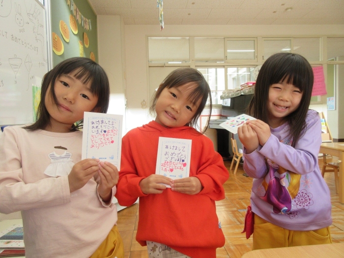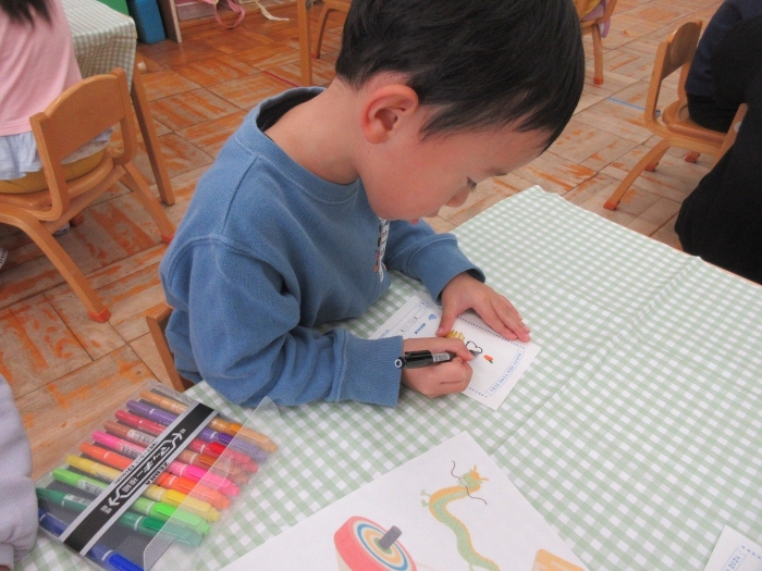 最初に先生から、どのような時に送るものか聞いた後、辰や鏡餅、富士山など、お正月ならではの絵を描きました!「私はお友だちに出すよ!喜んでくれるかな?」「届くのが楽しみだな♡」と、楽しそうに描いていました。届くのが楽しみだね♪