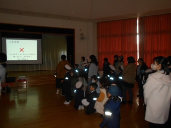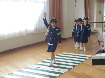 はなぞの会主催による「ちびっこおまわりさん」年長さんが参加しました。おまわりさんの服に変身し、まるばつクイズをしたり、横断歩道の正しい渡り方を確認しました。