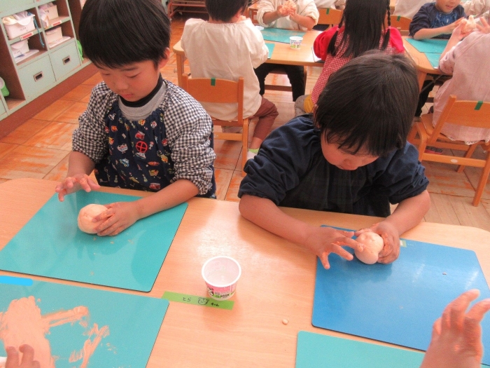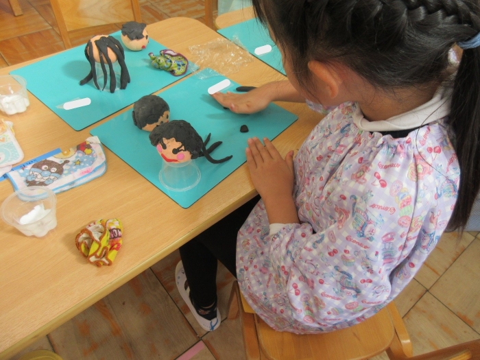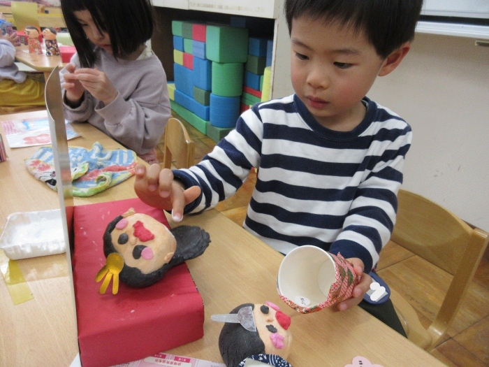 紙粘土と紙コップを使って、立体のお雛様とお内裏様を作りました。まずは、白い紙粘土にペールオレンジの絵の具を混ぜ込み、顔の土台を作りました。指に水を付け、紙粘土のしわが伸ばして、つやつやになるように丁寧に作りました。次は髪の毛や顔のパーツです。ひな人形の写真を見たり、本物を思い出しながら「髪の毛は長かったよね!」「顔のパーツは小さかったよ!」など、細かいところにもこだわりながら、楽しんで作ることができました。髪の毛一本一本、丁寧に細長くして装飾するお子さまもいましたよ😄