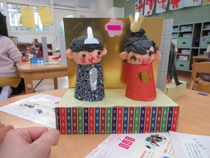 台座は、ボックスティッシュの空き箱に画用紙を巻いて、金の屏風も付けました。「本物そっくりだね!」「かわいくできた♡」と嬉しそうな表情のお子さまたち。ひな祭りが楽しみだね♪