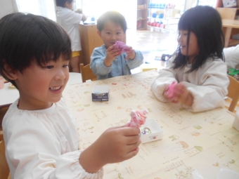 と粘土の感触や色の変化を楽しみ…