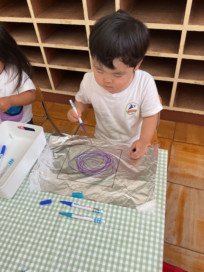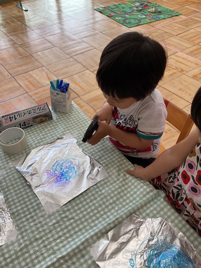 次に滲み絵でクジラを作りました。アルミホイルの上に、水性ペンで色をつけ、水を吹き付けるとクジラの色がきれいな色に!説明を聞いた時から興味深々にしていたので、自分の番になるととても楽しそうに取り組んでいました。