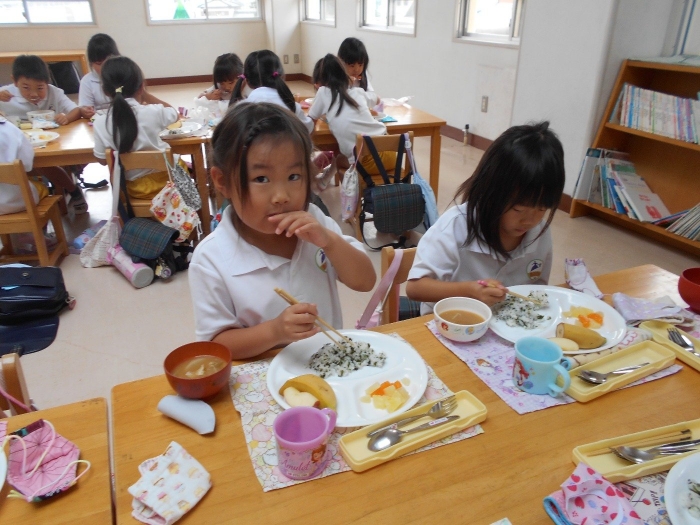 今日の昼食は、わかめご飯と団子汁♪(年長)
