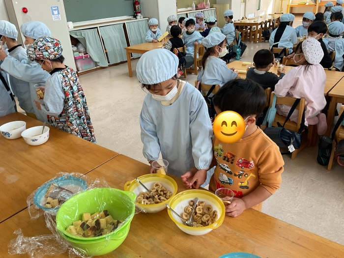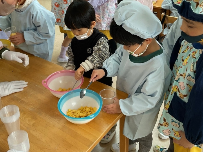 いざおやつ作りが始まると「作るの楽しみだね!」「何入れる?」と優しい声で話してくれる年長さんの姿がありました。