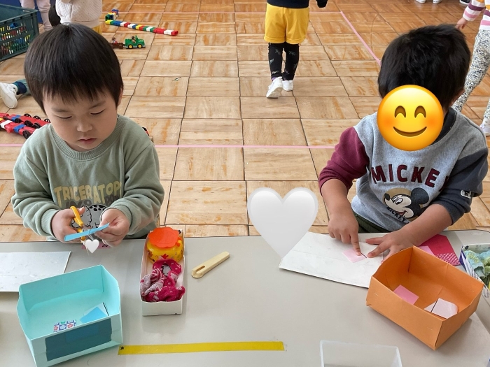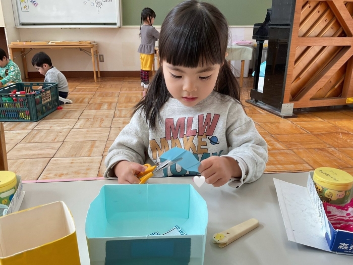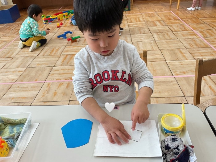 はじめてハサミ使い、一回切りに挑戦しました。指を切らないように気をつけながら丁寧に切ります。最初はハサミの持ち方がわからないお子さまもいましたが、先生と一緒に上手に切ることができました。