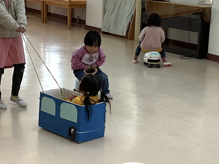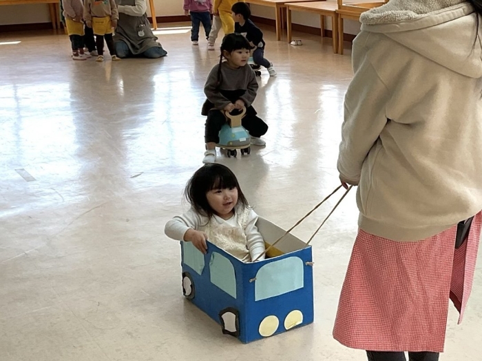 パトカーや車に乗って自分の足で漕いだり、バスに乗って先生に引っ張ってもらったり!