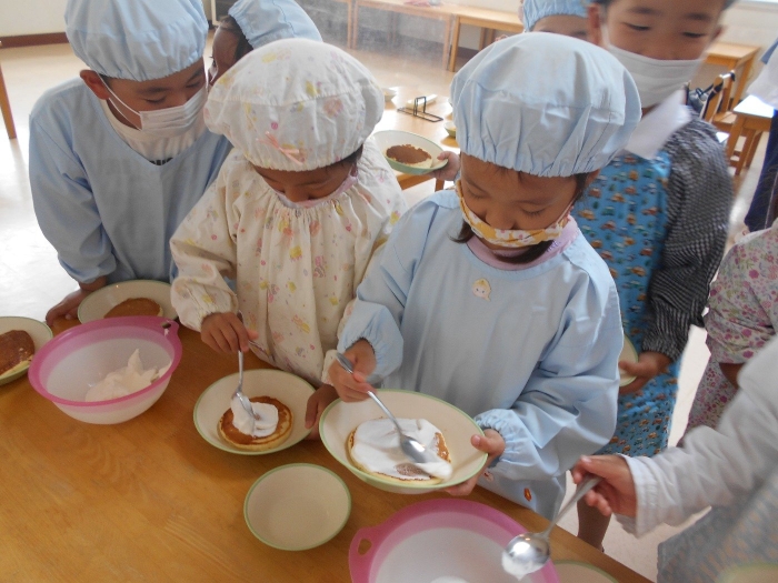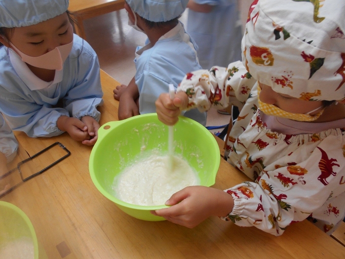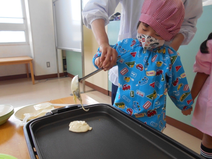 ことばの組がホットケーキ作りをしました。グループのお友だちと一緒に、ホットケーキミックス・牛乳を「ダマ」がなくなるまでしっかり混ぜ、熱々のホットプレートに流しこみます。「プツプツがいっぱいできたら裏返してみようか?」と先生に教えてもらい、ホットケーキをじーーっと見つめるお子さまたち。「みて!でてきたよ!!」と嬉しそう♡真剣な眼差しでホットケーキを無事に裏返すと、安堵の表情を浮かべていました。
