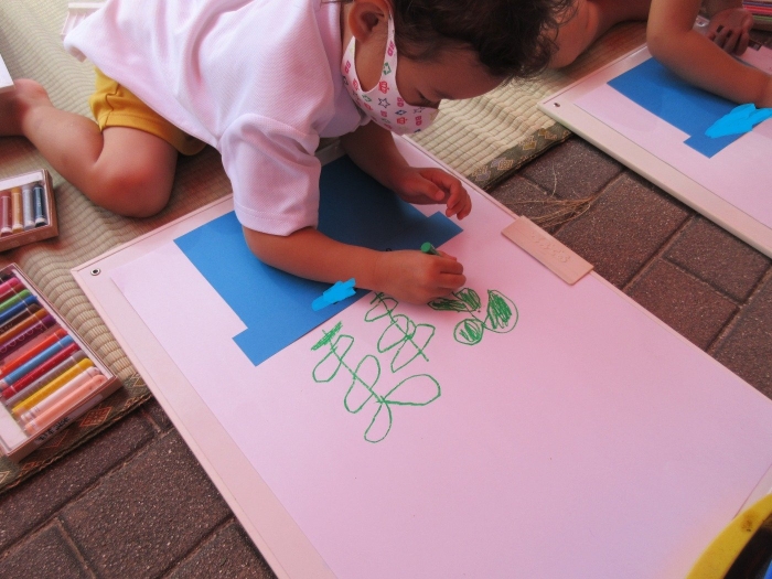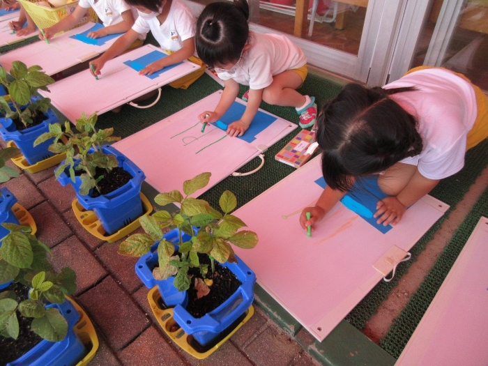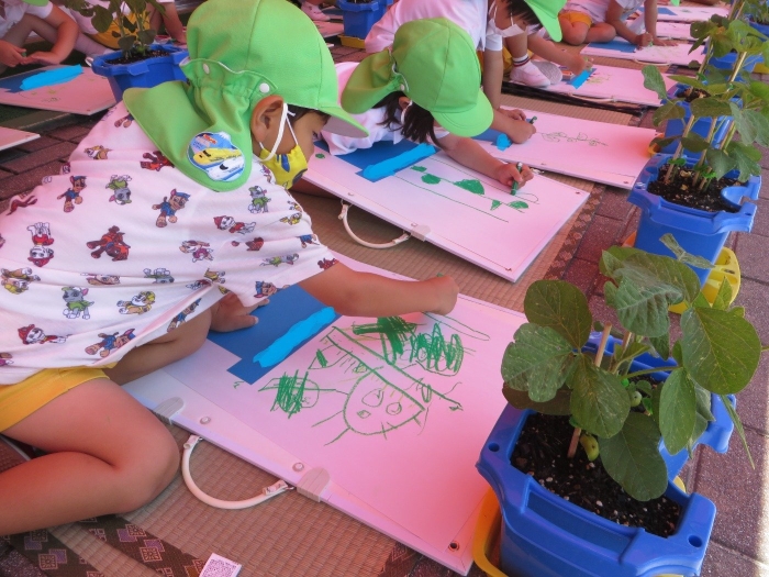 5月に植えた枝豆が大きくなってきたので絵を描きました!「どんな色をしているかな?」「葉っぱはどんな形をしているかな?」とよく観察しているお子さまが多くいました♪