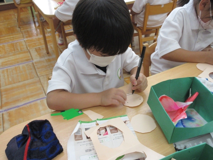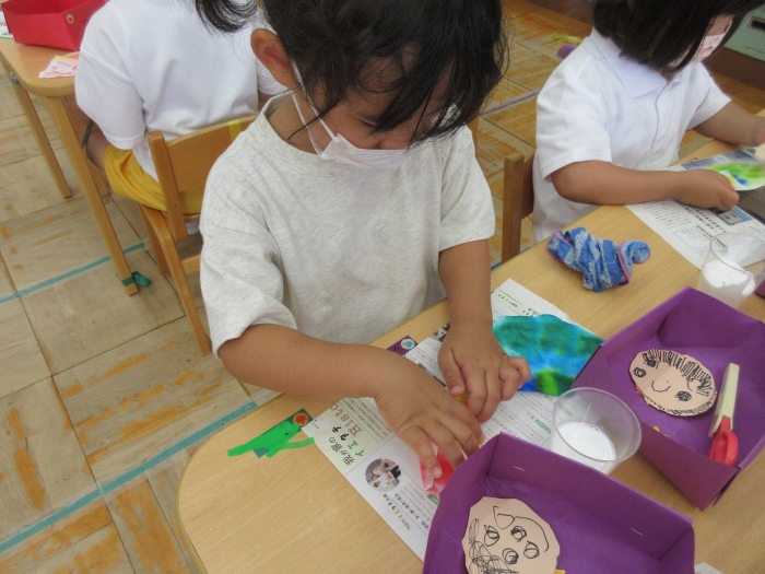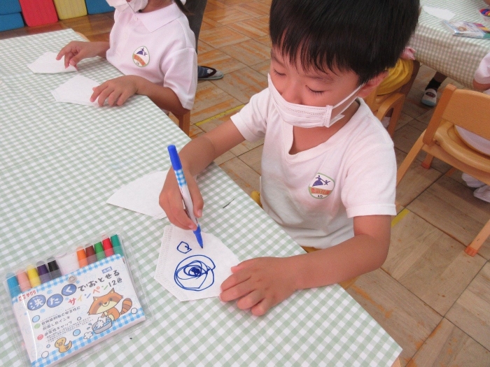 織姫と彦星の服はにじみ絵で模様をつけました!コーヒーフィルターに水性ペンで模様を描き、水を染みこませた筆でペンの上を塗ると・・・じわじわと色がにじみ、混ざり合う模様がとても素敵でした☆