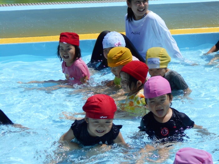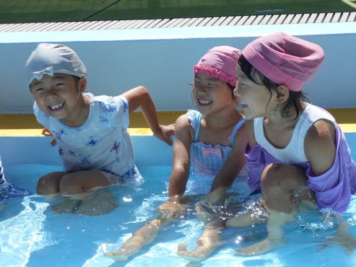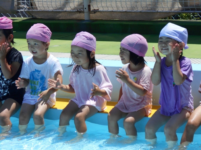 年少さんは、初めてのプールということで、まずはお水をパチャパチャとお顔や頭に自分でかけるところからはじめました(⌒∇⌒) ボールと貝殻で「色鬼ゲーム」もして楽しかったね!!