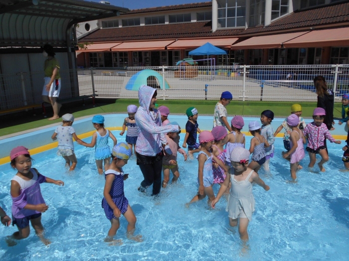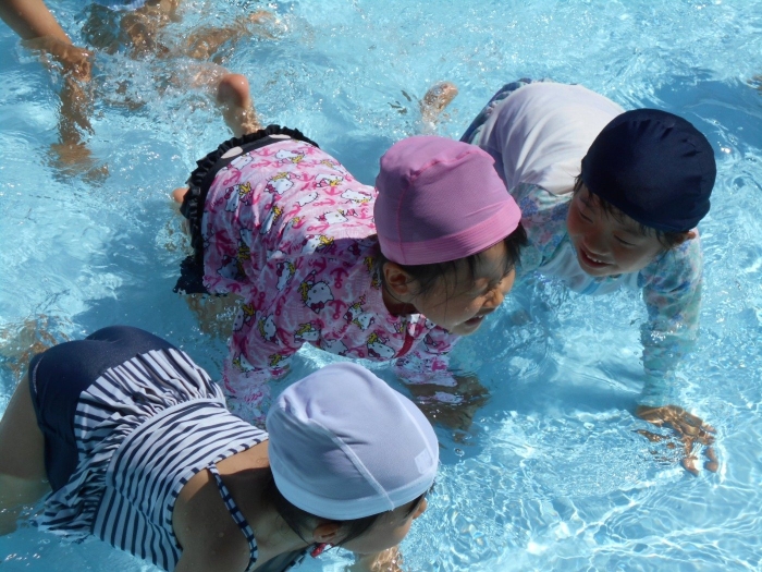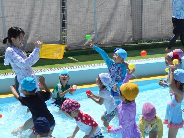 年中さんは、プールの中をお散歩したり、ボール入れ競争をしました!