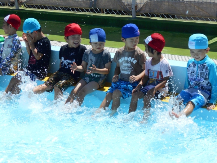 年長さんは、大きく足を振ってバタ足をしたり、ワニさん歩きをしたり、水がかかってもへっちゃら!!