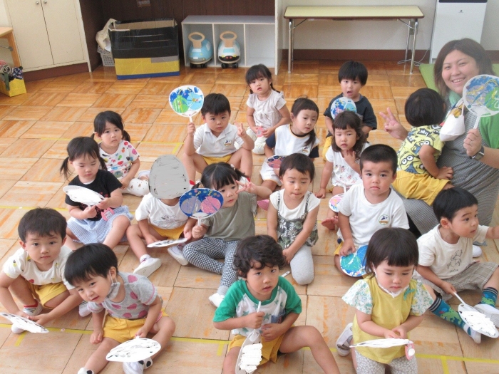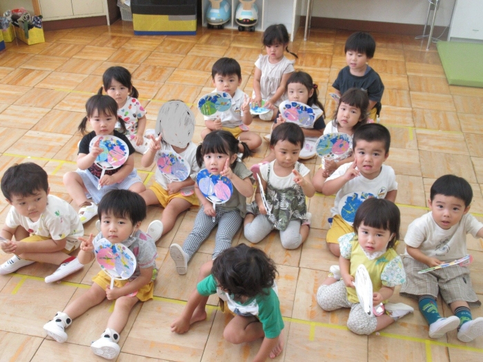 明日はいよいよ幼稚園の夏祭り!ということで、お部屋で手作りのうちわを持って最後の「じゃぶじゃぶ音頭」の練習を行いました!何度も踊っているだけあってみんなとても上手になりましたよ☆