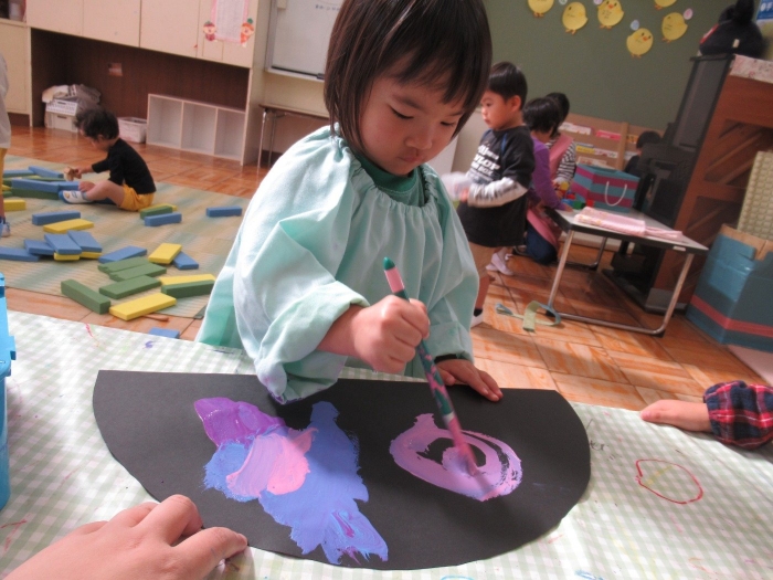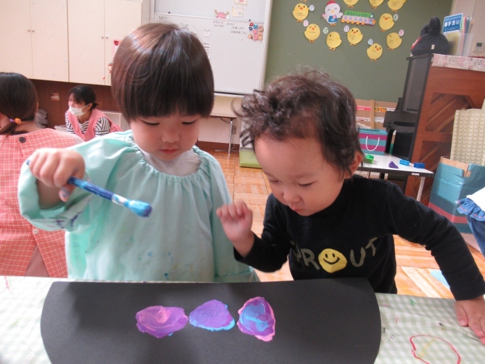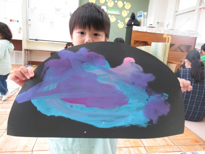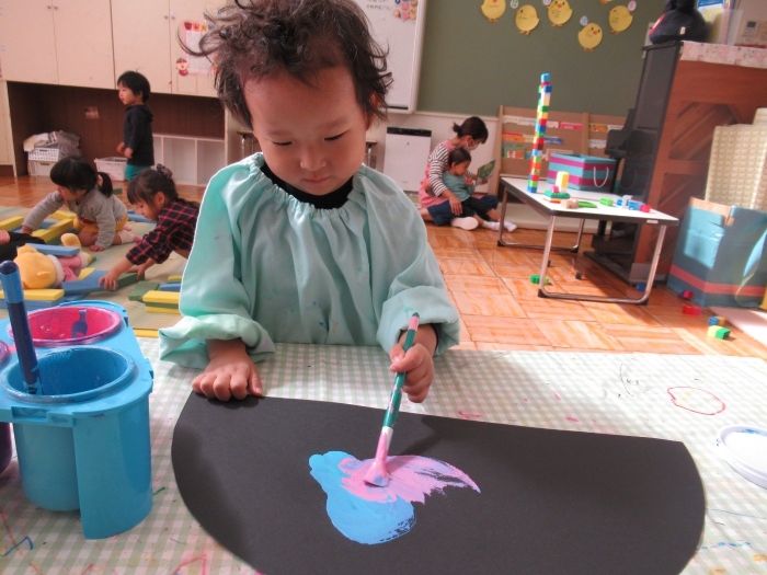 ハロウィンに向けてロケットさんは魔女の帽子を作りました☆水色・ピンク・紫の絵の具を使って帽子にキャンディーをたくさん描きました♪初めての絵の具でしたが、濃い目に溶いたトロトロ絵の具の描き心地や、色が混ざる楽しさからかいつの間にか集中しすぎて口が開いちゃった…なんて姿もあり、とても可愛かったですよ♡