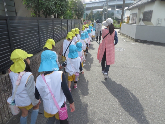 天気の良かった今日、年長のみのりの組と年少のおおぞらの組でお散歩に行ってきました!初めて関わるお兄さん、お姉さんに緊張気味の年少さんでしたが、年長さんが優しく「一緒に手を繋ごう」と声を掛けてくれたおかげで楽しく散歩に行くことができました!