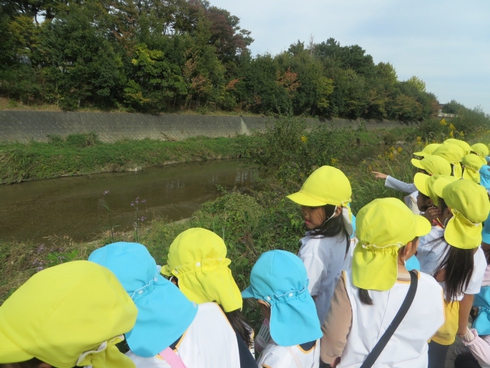 まず初めに行ったのは、中学校近くの川沿い!川にはたくさんの魚がいたり、小さな花が咲いていたりして見つけた子どもたちは大喜びでした♡橋付近では、まだ背が小さくて川の様子を見ることができない年少さんのために、場所を譲る姿もありました。