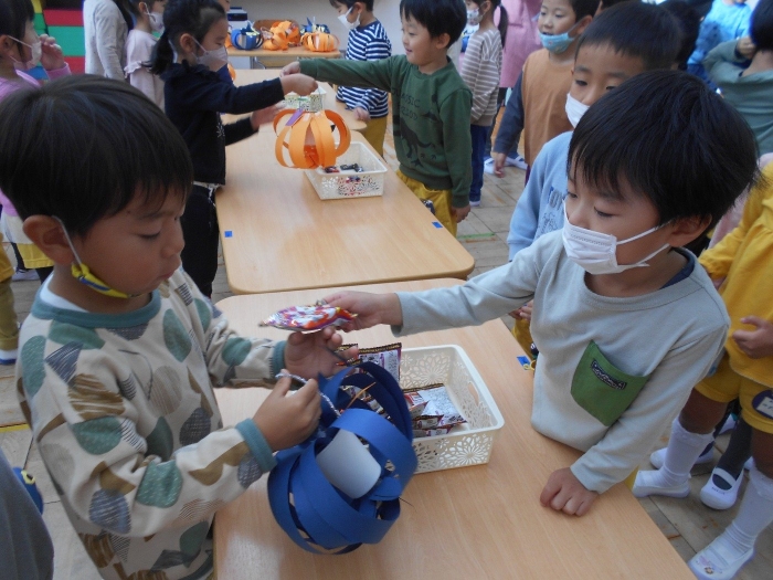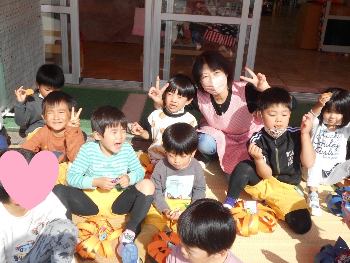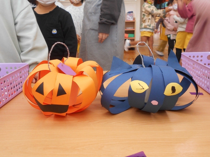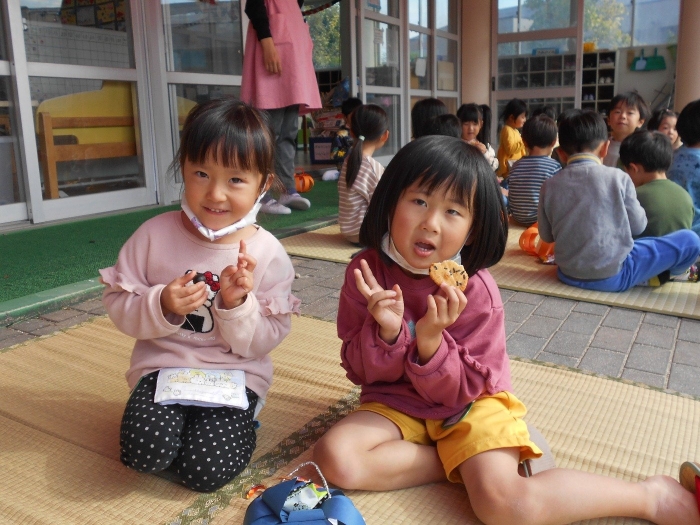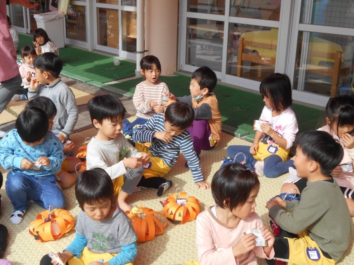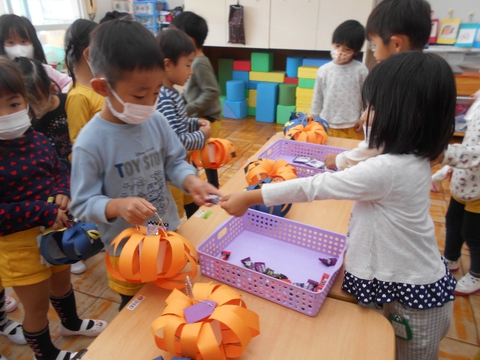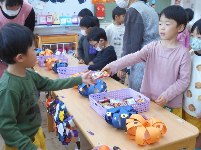 そして年中クラスでも「ハロウィンパーティー」をしました♡ この日のために作ったかぼちゃやネコのお菓子入れを持って、隣のクラスへ行き、「トリックオアトリート!!」と言ってお菓子をもらいにいきました。「トリックオアトリート」と言われたお子さま達は、「ハッピーハロウィン♡」と言ってお菓子を渡します。はじめは恥ずかしくて小さな声だったお子さま達も、ハロウィンの楽しい雰囲気に少しずつ大きな声で言えるようになり、「先生~♡3つももらえたよ!!」とご機嫌でお部屋に戻ってきました。そのあと、みんなで美味しくおやつをいただきました♡