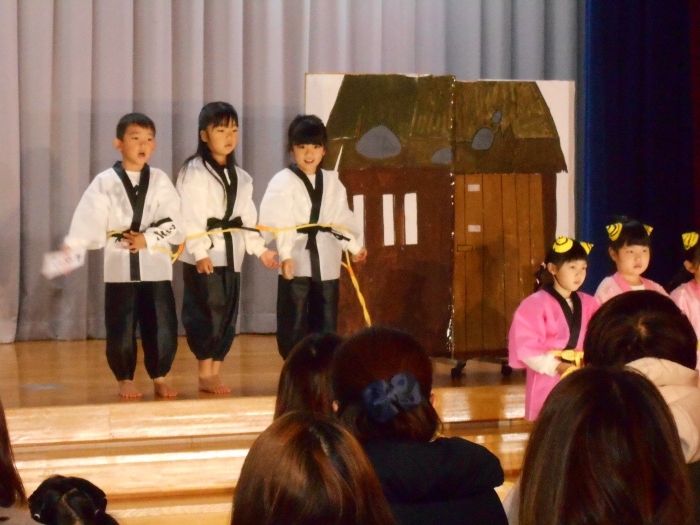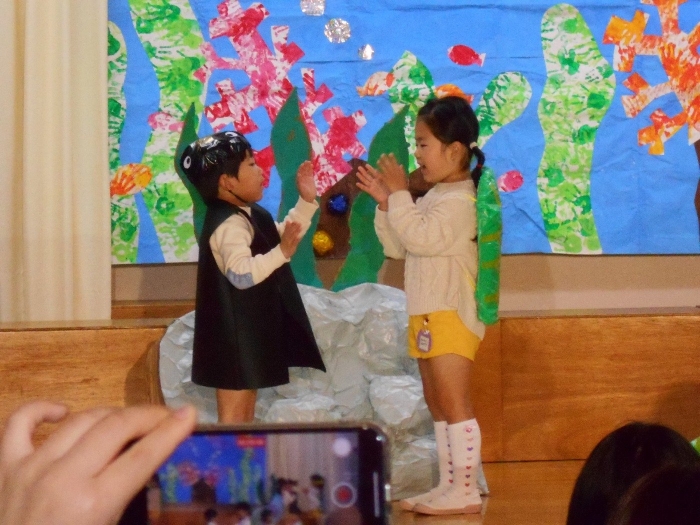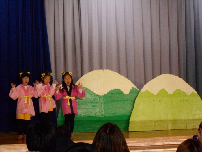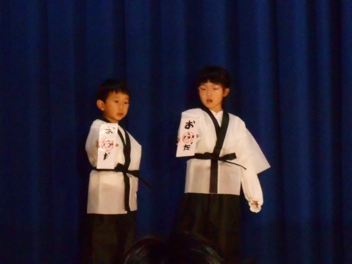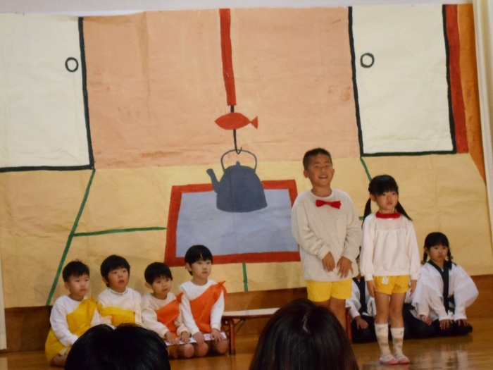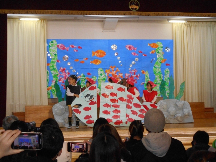 今日は年長の生活発表会を行いました。お子さま達にとって幼稚園生活最後の生活発表会です。みのりの組は「4まいのおふだ」ことばの組は「スイミー」を演じました。どちらのクラスも「絵本・紙芝居」を題材に、アレンジした劇です。