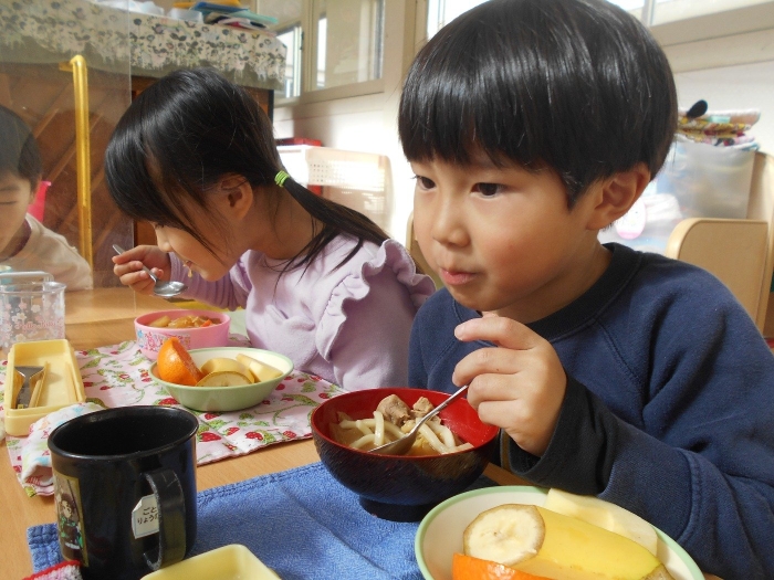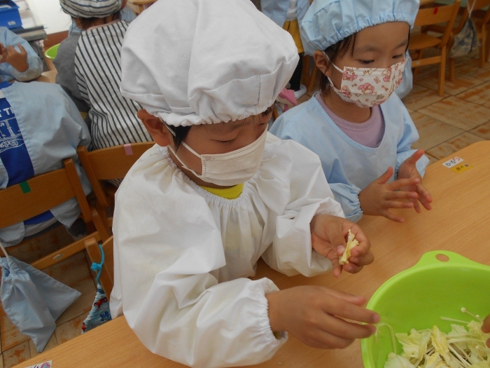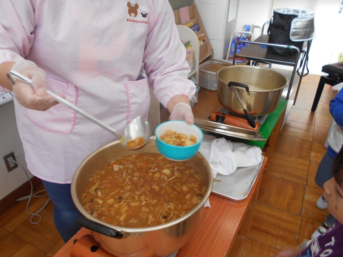 今日は年中のやまの組がランチ作りをしました。メニューは「味噌煮込みうどん」です。うどんに入れる人参・大根を包丁で切り、白菜・しめじ・えのきを手でちぎりました。1学期から何度も経験しているだけあって、どのお子さまもとても上手に野菜切りができました(^▽^)/ あとは大きな鍋でうどんと一緒にぐつぐつ煮込んだら完成です♡
